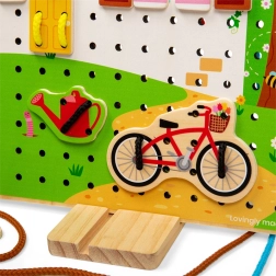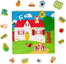 Nizalna plošča hiška BIGJIGS TOYS je idealna aktivna igrača za otroke od 3 let. Zahvaljujoč perforirani leseni plošči in pisanim vrvicam si lahko otroci iz posameznih delov ustvarjajo vedno nove prizore – od okenc in rož do kolesa ali oblakov. Pri tem naravno urijo fino motoriko, oko–roka koordinacijo in zbranost.