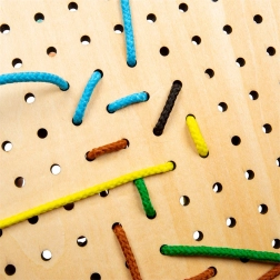 Nizanje vrvic skozi luknjice in pritrjevanje lesenih delčkov trenira prijem, natančnost gibov in zbranost.