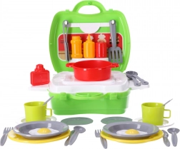 Ta kuhinjski set vsebuje vse potrebno za kulinaricne ideje vaših otrok. Je enostavno prenosljiv zahvaljujoč dizajnu v obliki torbe, zato ga lahko postavite in se igrate kjerkoli je to potrebno. Set je zasnovan tako, da razvija otroško domišljijo in pomaga otrokom prepoznavati predmete, medtem ko se zabavajo.