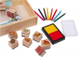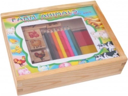 Ta set vsebuje širok spekter žigov, ki prikazujejo različne živalske prebivalce farme. Otroci si lahko vsak motiv pobarvajo s pomočjo 8 priloženih barvic, kar omogoča neskončne kombinacije barvnih vzorcev. Lesena škatla nudi idealno rešitev za shranjevanje vsega, kar otroci potrebujejo za ustvarjanje, zaradi česar je ta komplet tudi idealen za potovanja.